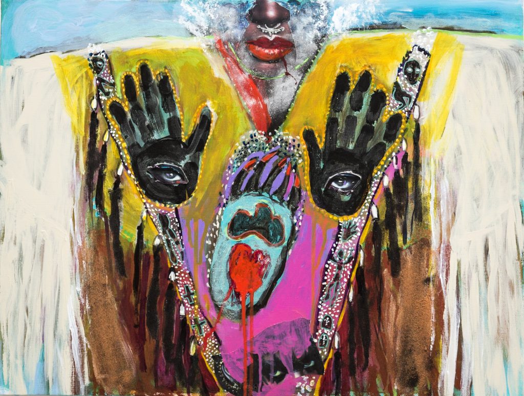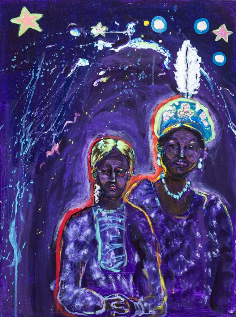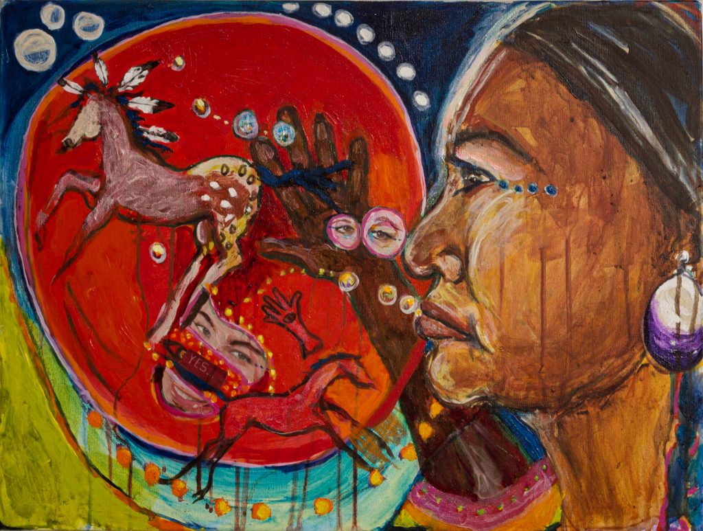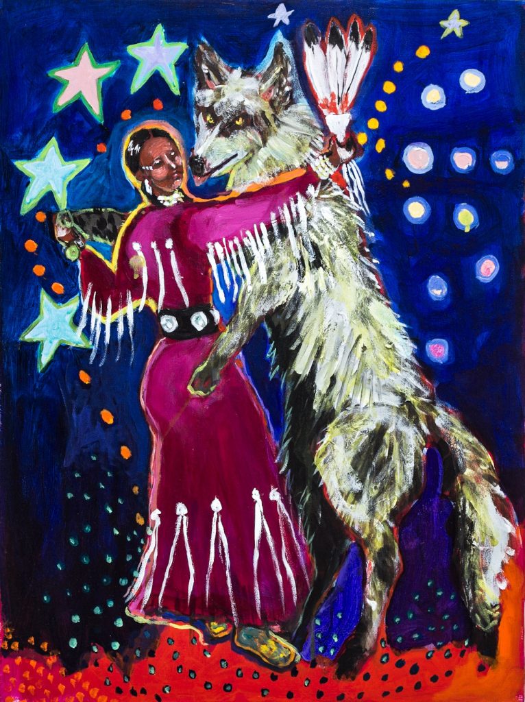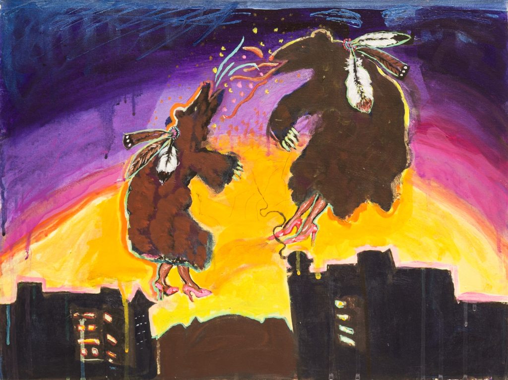 BLENDIANS: Acrylic on Canvas She Dances With Wolves :18”x24” Honor, Lozen:18”x24” Me and my Grandma: 18”x24” My Pony Dream: 18”x24” Bugbear an BearMaiden Over Harlem:18”x24” Mama’s War Shirt:18”x24”